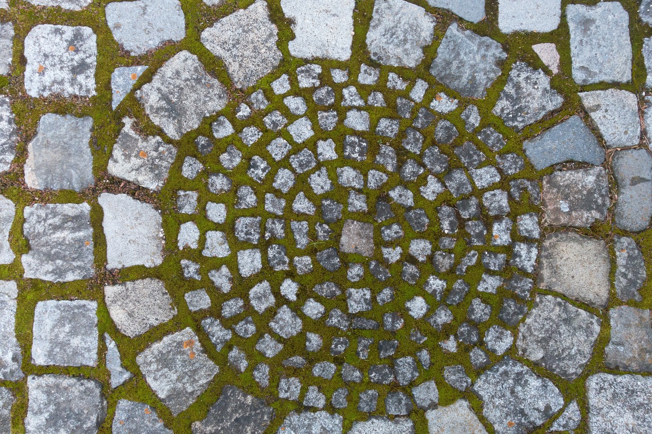 Porosty pojawiające się na kostce brukowej przed wejściem do domu lub innego budynku, takiego jak biurowiec czy...